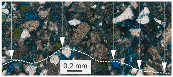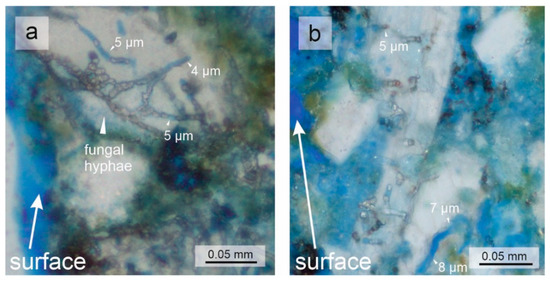 These biofilms settle with a superficial attachment on the stone substrate, but they can also extend roots inside the stone matrix (Figure 6). The fungal hyphae penetrate the calcareous substrate of BST, causing dissolution in the direct adjacent areas. This deterioration of the stone fabric by fungi was also described by [5,7]. The created network builds up a secondary porosity with a pore diameter of between 4 and 8 µm, and it may provide new pathways for water transport processes.