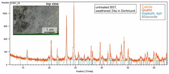 Results of the XRD analysis of the untreated and 24-years-weathered BST sample at the exposure site Dortmund. Detected gypsum in combination with dust particles leads to black weathering crusts on BST surfaces.