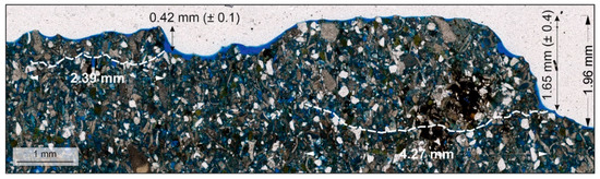 These significant changes in the original color of the investigated stone surfaces obviously occurred over time due to the influence of various environmental factors (also refer to [6]). Since visual and structural changes develop in the uppermost zone of the naturally weathered samples, thin sections have been examined at a microscopic level. In addition, changes from the stone surface to deeper areas of the stone were investigated in detail.