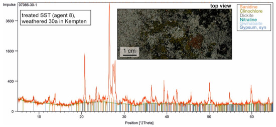 Results of the XRD analysis of the treated (agent 8) and 30-years-weathered SST sample at the exposure site Kempten. The examined SST weathering layer consists of gypsum (CaSO4·2H2O), nitratine (NaNO3), and gwihabaite ((NH4,K)(NO3)).