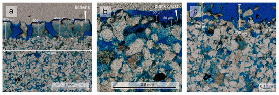 Figure 5 presents different types of lichens growing on the surfaces of 24-years-weathered treated (Figure 5a,b) and untreated (Figure 5c) BST samples. Independent of the initial surface treatment, organisms colonize the stone substrate extensively, leading to a reduction in the accessible open pore space, which can in general influence the water absorption behavior via the stone surface over time [10,28]. Biogenic growth on BST surfaces is detected with a size of a few 100 µm in height and width and a length of up to more than 600 µm. Due to swelling and shrinkage processes of the surface-covering biofilms, a noticeable disaggregation of the fabric may take place. Over time, this can result in a loss of cohesion as well as a loss of material in this uppermost zone (see Figure 5c, also refer to [5]).