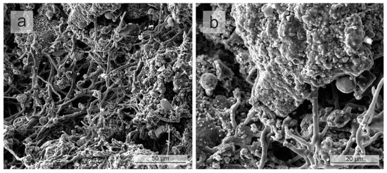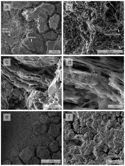 Using SEM images, the surfaces of the weathered treated and untreated stone samples can be analyzed with a more precise surface resolution. It could be observed that surfaces of BST (Figure 13a,b) are not only covered by dense colonizing microorganisms (e.g., lichens) but are also significantly affected by their activity. In Figure 13b, intensive biogenic rooting within the calcareous and clayey porous structure can be seen, with a firm attachment of the hyphae to the matrix. The calcareous substrate is disaggregated, showing pitting, microcracks and loss of material, leading to clear structural defects in the superficial zone and to an increase in surface roughness (Figure 13a).