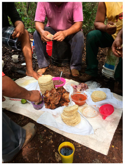 We finished our week of walking and talking around the ejido, and then I began excavations with a new crew. We worked through September 2017. Talk of Noma ended with the closing of the pop-up in late May, but the newfound emphasis on slow lunches and open conversations continued through the long field season. The time spent conversing during lunch profoundly shifted the culture of work at Tzacauil. Lunches themselves became communal, and increasingly elaborate (Figure 4). I documented most of the daily meals the men and I shared with my cell phone camera, and some ejidatarios began to do the same.