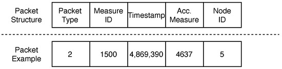 Figure 2 also depicts an example of a packet that the initiator receives during the measurement collection (i.e., the Figure’s bottom part). The information is read as follows: The initiator upon receiving a packet first, the first field, 2, which corresponds to the packet type in order to determine the type of information that is contained inside the rest of the packet. Next, the initiator knows which node created the measurement information by checking the last field, in this case, it is node number 5. The initiator knows that node 5 collected the measurement at time 4,869,390 (in milliseconds) and that this measurement is the 1500th that has been collected. Finally, the accelerometer measurement (which is the result of euclidean distance calculated using measurements for three axes, x, y, and z from within the accelerometer sensors) is equal to 4637.