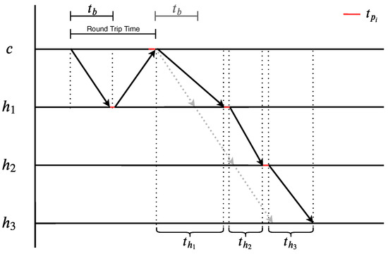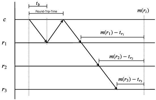 In the first phase of the algorithm where the estimation of is derived, it is observed that also takes into account so each arrow also represents a packet transmission that also contains the part. Note that the processing time of a packet might defer between transmissions depending on the node’s current load upon the packet reception. Since all nodes calculate their time differences using the static variable and the real transmission times are variable, a node with distance might be more accurately synchronized compared to a node whose distance is .