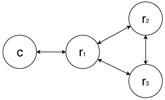 This experiment aims to evaluate the accuracy that can be achieved by the synchronization algorithm described in Section 4. The developed WSN comprises three nodes that are based on the hardware described above. For the experiment, custom-designed code based on the Arduino board was designed. The experiment aimed to evaluate the accuracy of the synchronization algorithm, and for that timestamped events are required. In order for all nodes to measure a timestamp simultaneously, a common event that can be sensed by all of them needs to be created. All nodes of the WSN during the experiments are in a common space and they can communicate directly with each other. The WSN topology is created manually, which means that while the nodes are able to communicate with all others, they are programmed to ignore transmissions from certain nodes, effectively creating the desired topology, depicted in Figure 5.