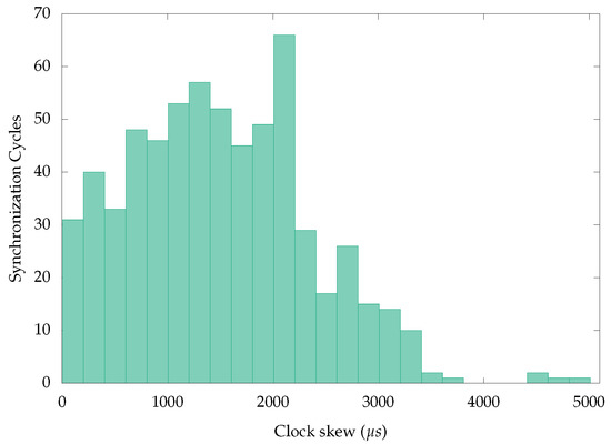 Figure 6 contains the clock skewing right after the synchronization of the WSN’s router nodes combined in one figure. The results show that the mean clock skew achieved by the WSN is equal to 1502 s with a minimum value of 4 s and a maximum of 5012 s. It was observed that the synchronization algorithm can synchronize the nodes with a skew of around 2000 s. More specifically, it was observed that 75% of the skews measured during the experiment were less than 2088 s while the peak of values (63 out of 638 skews) in Figure 6 were between 2100 s and 2300 . Finally, it was observed that only seven out of a total of 638 skews measured had values greater than 3500 .