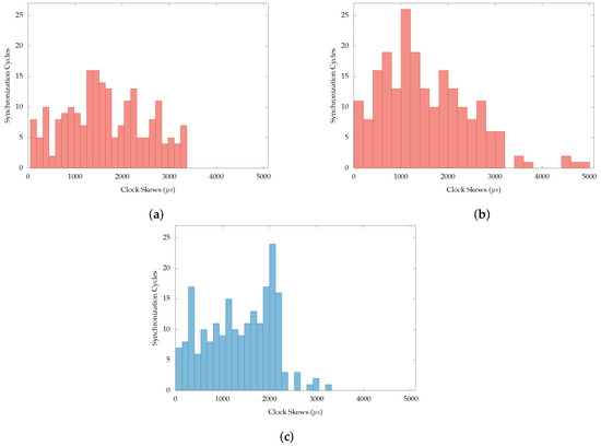 The figures contain the local time differences (Δt) from the initiator’s synchronization clock () organized in histograms. (a) Time difference in all synchronization cycles on node synchronization cycles where (b) Time difference in all synchronization cycles of node synchronization cycles where (c) Time difference in all synchronization cycles of node synchronization cycles where .