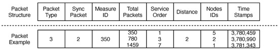 The entire packet is depicted in Figure 10. Packet type is used for distinguishing between the different packets a node might receive during the experiments. Sync packet contains a counter that shows how many transmissions a synchronization packet is subjected to until it reached the current node. Measure ID is a counter that shows how many measurements has made since the synchronization. Total packets is a counter that shows how many packets a node has serviced so far. This field might contain multiple counters since each node that receives the packet appends its own counter. Service order also gets updated by each node by appending the number of packets it has serviced until the current packet reception. This counter is reset for every new measurement. Next, distance shows the distance of node from c. Node IDs contain multiple node identifications from all the nodes the packet passes through. Finally, timestamps also contain multiple timestamps from every node in the packet’s path to c. Note that information (i.e., total packets, service order, and timestamps) for diagnostics and the synchronization evaluation purposes is introduced in the packet.
