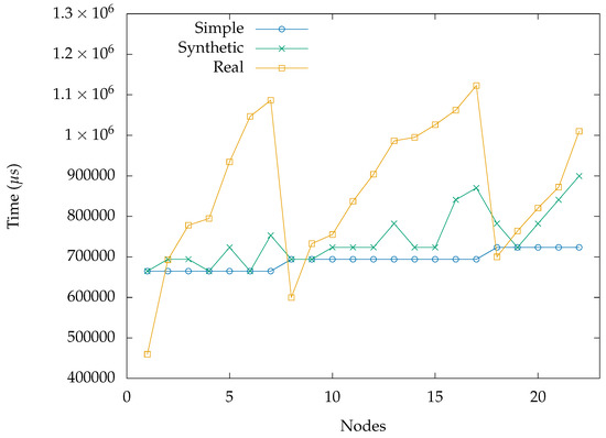 The result analysis shows that the synthetic model, which uses the delay introduced by the packet congestion on each node , has variable results. More specifically, it appears that while the synthetic model curve is lowered, the real arrival times curve tends to move upwards with a smaller rate. Additionally, by comparing the line arrivals of packets to the initiator, it was observed that many nodes such as , despite having bigger distances in hops () than (), managed to transmit it much earlier. This phenomenon is present due to synchronization inaccuracies introduced by the triple broadcast packet transmission employed by the ZigBee protocol during the synchronization phase of the WSN. This phenomenon was described in the previous experiment in Section 5.1. Additionally, another factor that causes variant packet arrival times for the initiator is the CSMA/CA mechanism used for unicast transmissions.