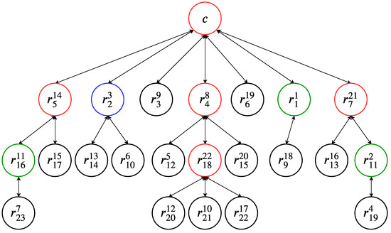 The synthetic model takes advantage of information related to each transmission that takes place in the network. As already described, the packet of information transmitted by each node—by the time it reaches the initiator—contains information that helps determine a small portion of the delays () that each one is subjected to while being propagated to the initiator. The current model employs this information to estimate the delivery times of each packet to the initiator. Figure 12 depicts the network’s topology formed during the experiments in the Ionian Campus testbed. For the analysis, this Figure contains only part of the topology, and more specifically the tree topology which uses the predefined paths connecting all nodes to the initiator. Each node is tagged with two numbers that contains information related to the results of the experiment depicted in Figure 11, where i represents the Node ID and j shows the order in which the initiator received each packet. For example, node is the fourth node in the figure and its packet was the eighth in line that arrived at the initiator. The colors in the current Figure are used to indicate a node’s load of packets. Notice that black is used for the leaves of the tree where those nodes are not parents to any others so they only serve the packets they create. Nodes colored with red outlines serve at least four (4) packets, including their own. The blue outline is used for nodes serving three (3) packets and the green ones only serve two (2).