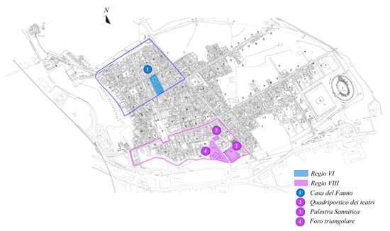 Plan of the archaeological Pompeii site and localization of the research areas: Casa del Fauno at Regio VI and Quadriportico dei Teatri, Foro Triangolare and Palestra Sannitica at Regio VIII.