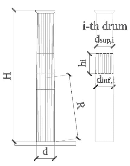 According to what was found in previous numerical studies [2,3,12], the definition of the overall main geometrical properties of multidrum stone columns could provide a very useful tool for the primary evaluation of their seismic vulnerability. Therefore, an extensive geometrical survey aimed at defining the mean overall geometrical properties of the studied columns was performed. The following data were collected related to columns and drums: (i) the column overall height, H, (ii) the diameter of the drum at the base, d, (iii) the drum height, hi, (iv) the drum diameter at the bottom, dinf, and (v) the drum diameter at the top, dsup. Thus, the aspect ratio H/d and the distance from the center of mass of the column to the circumference at the base, R, were also evaluated (Figure 3).
