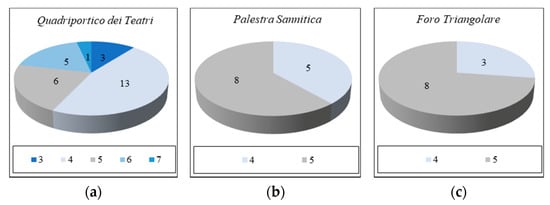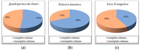 Figure 5 shows the percentage of complete and incomplete columns in the investigated areas. Palestra Sannitica had the lowest number of incomplete columns, while Foro Triangolare had the highest one, with more than half of the total columns being incomplete. The total number of incomplete columns was 48 out of 103.