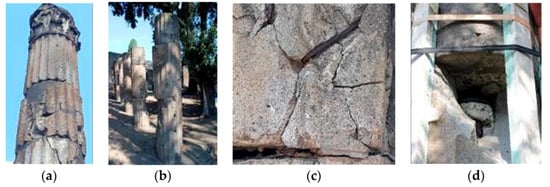 This section presents and discusses the critical issues commonly found in several columns in the research areas. In particular, anthropic and natural phenomena resulted in material damaging and general decay of the columns. They can be summarized as follows, see Figure 9: (i) weathering, cracks and detachment of the building material; (ii) irregular shape (initial tilting and partial lack of contact among the drums); (iii) presence of corroded metallic devices (i.e., ties to connect drums) and too invasive interventions.