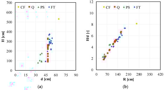 Relationship between geometrical parameters of all the incomplete multidrum columns: overall height versus diameter at the base (a), aspect ratio, H/d, versus R (b).