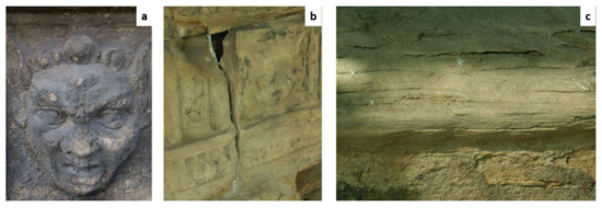 Figure 2a shows an example of the black crusts observed that were visible in all the façade with different extensions and concentrations depending on the area and the material concerned [28,29,30,31,32]. Other degradation factors caused other types of damage on the façade, including fractures (Figure 2b) and sandstone exfoliation (Figure 2c).