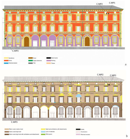 Façade elevation of the Orsi-Marconi Palace with the sampling points called C.MP1, C.MP2, and C.MP3: (a) elevation with in evidence the materials used for the construction of the building; (b) map of the deterioration on the façade of the building.