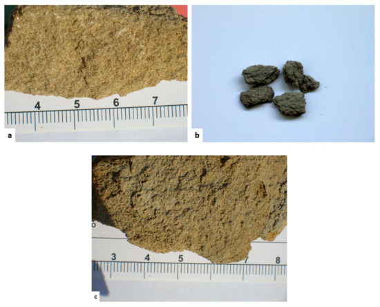 Detail photo of the three samples observed through macroscopic observations: (a) C.MP2 sample of unconsolidated yellow sandstone; (b) C.MP3 sample of unconsolidated grey sandstone; (c) C.MP1 sample of consolidated yellow sandstone.