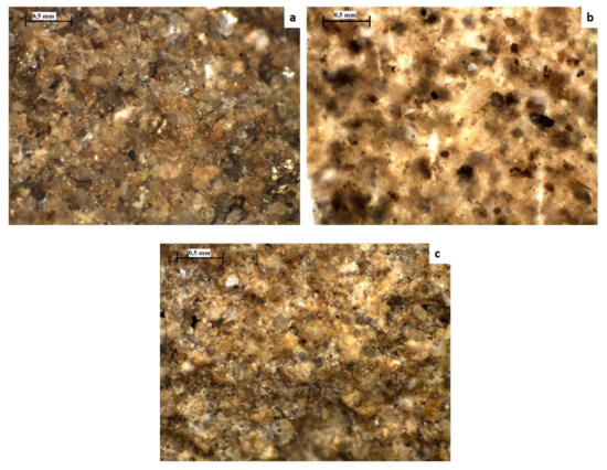 Figure 6a shows the 35 x magnification microscopic analysis of the C.MP2 sample. It was possible to observe the individual granules of the unconsolidated yellow sandstone: their size was homogeneous and the clasts were rounded. Quartz and mica (muscovite and biotite) were well observed.