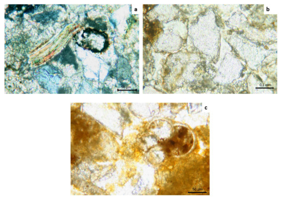 The observations of the sample C.MP1 at 25 x magnification and parallel nicols showed spheres of foraminiferal shells, in which the darker coloured organic component was clearly distinguished inside. These were probably globigerine, benthic foraminifera typical of a marine Quaternary sedimentation environment (Figure 7c) [41,42]. Inside the clasts and fractures of the consolidated yellow sandstone, it was possible to observe the consolidating agent (greyish). Overall, the clasts appeared more cohesive.