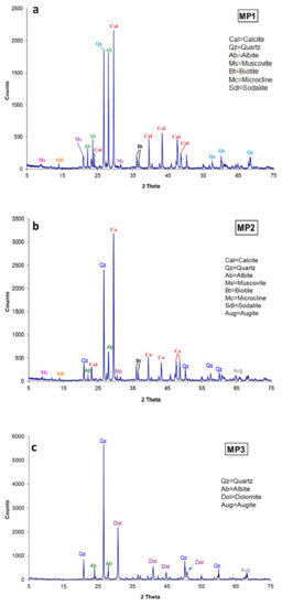 Figure 8 shows the spectra of the three analysed samples, which allowed to compare the characteristics of the samples analysed with other techniques. The main minerals analysed were calcite (Cal), quartz (Qz), albite (Ab), dolomite (Dol), muscovite (Ms), biotite (Bt), microciline (Mc), sodalite (Sdl), and augite (Aug), as shown in Figure 8.
