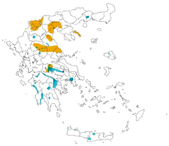 Visited territories with earthen architecture in Greece. Blue color area: where raw earth’s construction techniques have been recorded by authors. Brown color area: with raw earth’s construction techniques according to G. Bei, Terra Europae, Earthen Architecture in the European Union, 2011.