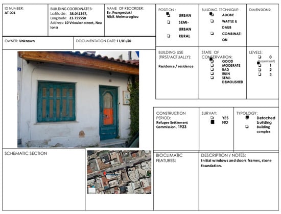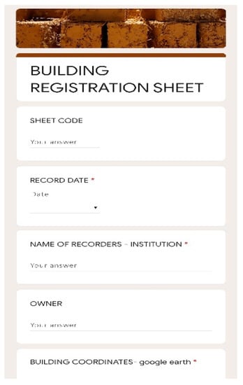 The inventory recording tables are the main mapping tool for existing earthen constructions. The places visited are chosen based on readings, physical and historical maps, as well as on experience-based criteria. This approach is based on projects carried out elsewhere in Europe, such as clay buildings in Abruzzo, Italy [3,4], which have been taken into account. In order to cover the needs of this project, an analogue and digital template was created for the documentation of each building. They are being filled in with data collected in situ and from other available sources. Up to now, approximately 1000 such tables have been filled. In more detail, the tables include data related to geolocation on a map, building coordinates, building techniques, preservation notes, building condition at the moment of documentation, and technical-construction characteristics (see Figure 2).
