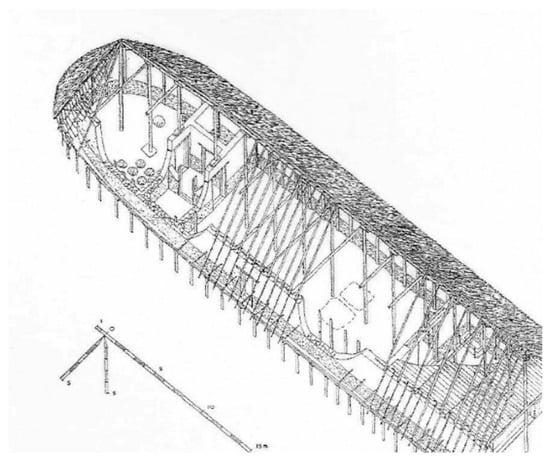 In the early historical times (1100–700 B.C.), rectangular buildings, but also some more plastic–organic in shape, are constructed, apart from the stone foundation, with either adobe brick or earth-coated canes [8]. A typical example of a large arched building is that of Tuba, in Lefkandi, Euboea (Figure 5) of the 10th century B.C., made of adobe on a stone base 1 m high [8].