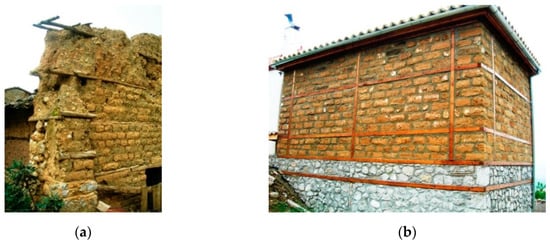 In lowland areas where stone is scarce, such as the Thessalian plain or the Mantine plain in the Peloponnese, there can be found purely adobe brick structures with just a law stone foundation. In semi-mountainous areas, the percentage of stonework increases, and the use of adobe is usually limited to the upper floor or even in small parts of the bearing structure, as is the case in the Prespa lakeside settlements [12]. Often, but not always, the adobe brick structure is reinforced with horizontal wooden beams that run along the width of the walls at a certain height, ensuring that they are more effectively connected among themselves, usually repeating every 1 m height (also called xilodesies) (Figure 7). Almost always, these buildings are covered with tiled pitched roofs (with 1, 2, 3, or 4 slopes). Regarding the most recent applications of this method, there can be found a combination of adobe with reinforced concrete elements. The organization of building with adobe bricks was based on and required the involvement of the population of the local community; it had clear rules such as the specialization of craftsmen, participation of the users and their neighbors, specific work scheduling, financial organization of the pre-construction and construction phase, specific organization of preparation and transportation of the adobe bricks, and application of traditional technical building rules. One could say that building with adobe bricks had a significant cultural dimension, which unfortunately has been lost in our current world.