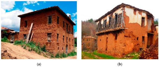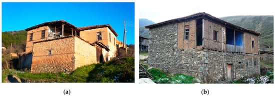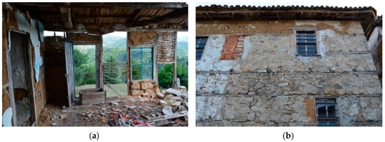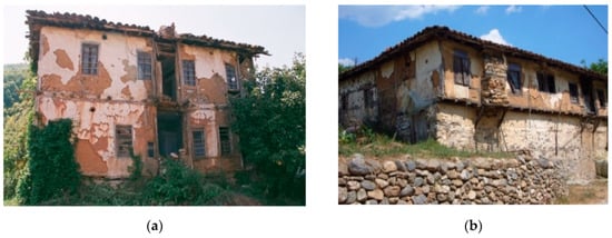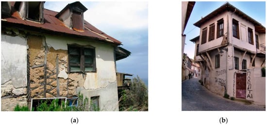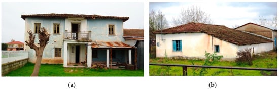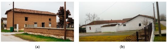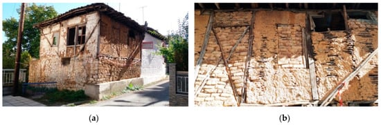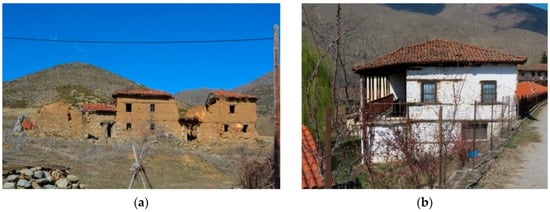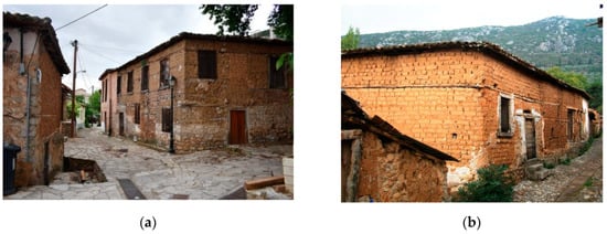 Earthen architecture in Florina: (a) Antartiko, adobe brick house (photo by G. Chrisafaki); (b) Agios Germanos, raw brick house (photo by G. Chrisafaki).