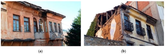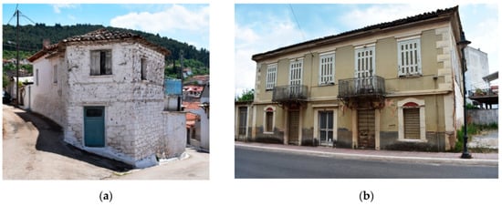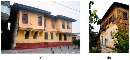 These are mixed-structure buildings, with adobe brickwork on the ground floor and a timber frame structure filled with adobe bricks in the upper floor. As far as their typology is concerned, these buildings follow the traditional standards of their period of construction, although they are also gradually being enriched with neoclassical elements. The newer earth buildings are characterized by neoclassical and/or neoclassical-like architectural elements, and they can be either one- (Figure 19a) or two-story buildings, such as Rizopoulou’s house (Figure 19b) in Larissa [16].