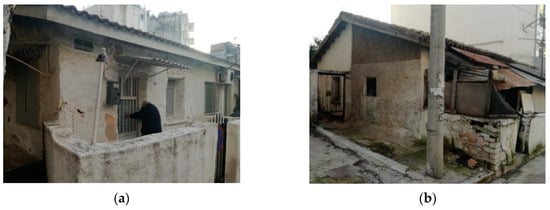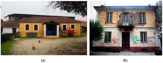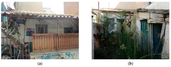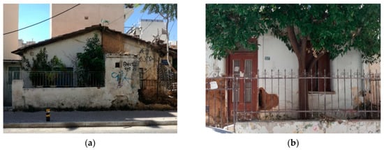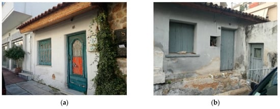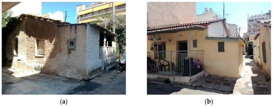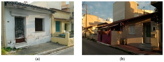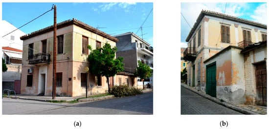 Kaisariani, Athens: (a) Moschonision and Manolidis street, main view of a building with a gabled roof that includes two properties; (b) Ephesus street 48, adobe house with neoclassical–like architectural elements (photo by E. Frangedaki).