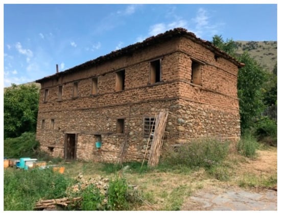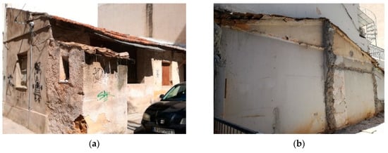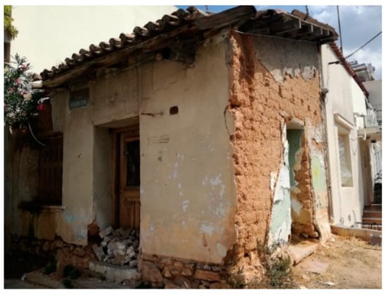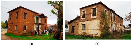 Traditional building with adobe bricks, mainly in the lowland where earth was abundant, adapted to the new standards and was systematically implemented until at least the middle of the last century. Today, in many areas of the Peloponnese and Central Greece, several adobe buildings of various uses mainly built after the end of the 19th century can still be found. These buildings are located in rural (Figure 12) and semi-urban areas, but also in urban areas (see Figure 11, Figure 12, Figure 13 and Figure 14).