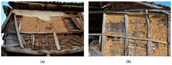Wooden frame walls (wattle and daub) are a technique made with a lattice of vertical studs and horizontal wattles, woven together like a basket. A mud of earth and straw is then daubed onto latticework, forced into the gaps, and smoothed over to fill any gap. The final surface can be left as a rustic finish or rendered with earth to make a smoother surface. A wooden frame more rarely is made of flexible tree branches. The surfaces of the buildings already studied were coated with mud and enriched with straw or hair, hay, or other fibrous materials for reinforcement and for better adhesion to the substrate. The thickness of the wall can range from 0.15 to 0.20 cm, so this makes the technique ideal for dividing interior spaces. When the construction is reinforced with diagonal elements and properly connected with the other building elements, it gives rise to earthquake resistance [14].