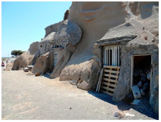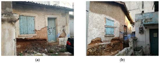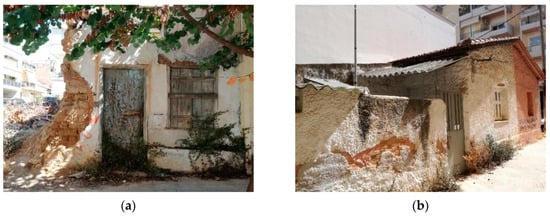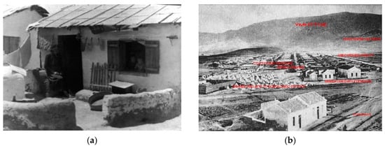 Since 1910, and with a dramatic surge in the years 1922 to 1924/25, refugee waves flooded Greece with five million inhabitants, increasing the country’s population by 1.5 million, mainly women and children. The urgent need for permanent housing, especially during the early stages of migration, where the scarcity of resources and especially building materials was enormous, was largely covered by simple earth-based construction techniques. Usually these techniques were performed by the method of self-manufacture with in-situ materials. The main construction technique was based on load-bearing adobe brick masonry and more rarely on timber structures [21,22] (Figure 37a,b). Earth buildings and settlements of that time are still found today in the refugee’s first settlement areas.