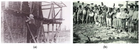 Adobe constructions in the early twentieth century: (a) Refugees’ timber-framed self-structure (Megalooikononomou archives); (b) Construction of raw bricks by refugee kids (NGM, Tmavridis archives).