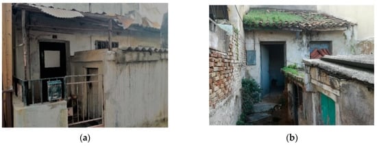 The urban residential patterns of settlements have been based on orthocanonical plans. The module, which was repeated, consisted of a one-room house around 20 m2 for a small family and a bigger one, around 35 m2, for bigger families. An often-designed pattern consisted of sixteen small and eight bigger houses. Some of the houses were semi-detached, built as pairs in which each house’s layout is a mirror or exactly-repeated plan and façade. One room, around 20 m2, was given for every family, and in most cases, the relatives of the family lived in adjoining rooms. The rectangular design of each block had dimensions close to 30 × 18.5 m2. Every settlement had one door and one window in the front façade. A door on the back wall connected the room with the common space in the middle of the block. The following photos are from the Eleftheroupoli neighborhood in Nea Ionia (see Figure 40, Figure 41, Figure 42, Figure 43, Figure 44, Figure 45 and Figure 46).
