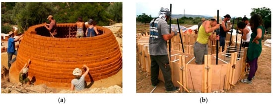 Piliko team: (a) Adobe construction; (b) Experimental constructions based on rammed earth technique during workshops (photos from Piliko archive).