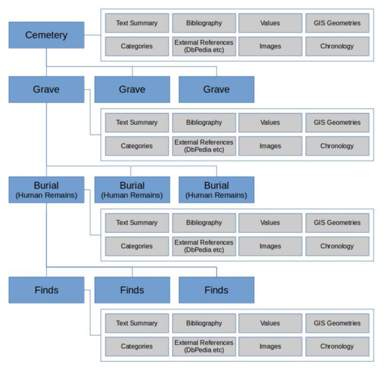 The THANADOS data model (Figure 1) was based on four hierarchical levels, where the site/cemetery functions as the parent entity for multiple graves, each grave as parent entity for one or multiple burials and finally each burial as parent entity for one or multiple finds, if applicable.