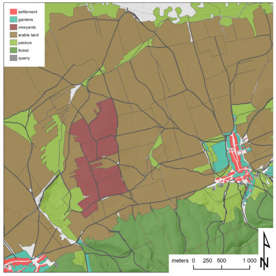 To illustrate this, the Franciscan Cadastre [22,24], a 19th century cadastral map, was vectorized as polygons for the study area and imported into OpenAtlas. The individual areas of the map were divided into the following categories based on the original division of the cadastral map (e.g., buildings, gardens, vineyards, agricultural fields, meadows, forest, water bodies, quarries and cemeteries) (Figure 5). Paths, rivers and borders were mapped as polylines. In addition to the representation of the different land uses in different colors, the respective toponyms were also documented where these were indicated.