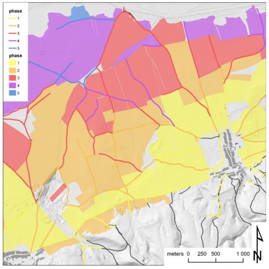 For example, based on an approach already pursued by Klaus Schwarz in the 1980s [25,26], a stratigraphic analysis [38] of agricultural fields and path-networks indicated in the map was carried out. Based on the assumption, the paths running along adjacent fields (concordant) must be as old or older than these, while paths that intersect certain fields (discordant) are younger, a depiction of the development and relative chronology of the path and field system was deduced. Based on this approach, a depiction of different development phases is possible, indicating areas with older and younger fields and paths (Figure 7). This could, for instance, be used to detect desertification by searching the path and field systems for older structures that could indicate former villages or farms, or simply to achieve a deeper understanding of diachronic development processes, as well as a tool for a general historic landscape characterization [39].