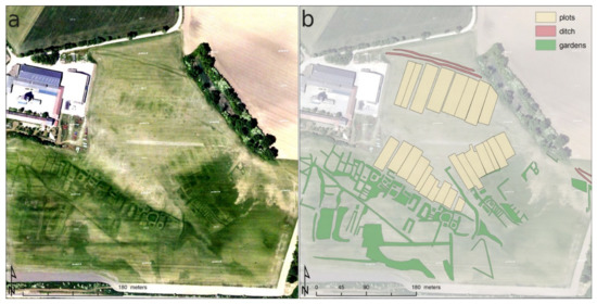 (a) Aerial photograph showing the remains of an abandoned late medieval village in Lower Austria, emerging as cropmarks. (b) Interpretation of assumed farm plots, gardens and a surrounding ditch system. (“Orthofoto TileCache of Austria”, by https://www.geoland.at; licensed under a Creative Commons Attribution 4.0 License, accessed on 21 February 2017).