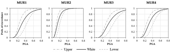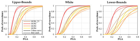 - for each vulnerability class (from A—high to F—low) of the macroseismic model a fragility curve corresponding to a DS2-3 damage grade was calculated, to be compared with the mechanical ones obtained through the Vulnus VB 4.0 approach;