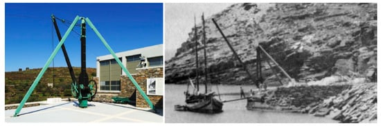 A marble lifting machine (crane) dominates the entrance of the museum (Figure 1, left) and arouses the interest of visitors at the beginning of their visit. This pre-industrial crane, known as “biga”, had a pivotal role in the mining business; it belonged to the “Karageorgis company at Vathi”, a quarry located at the north-west coast of the island. The company employed up to 70 workers from the surrounding villages and spread across the main quarry’s springs and its port. The crane’s use was inside the quarry, where a railway wagon loaded large blocks of marble to carriage at the dock. Another crane was at the quarry’s port, where the blocks were loaded on boats for transport to other parts of Greece and the Mediterranean (Figure 1 right). Five to seven people controlled the crane: one person that overviewed the process and signaled the workers accordingly, two workers were operating the machinery and another small group of workers that tied and untied the volumes of marble on the crane’s hook and guided the blocks’ lifting and landing.