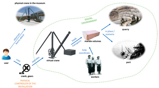 Our interactive installation attempts to fill this gap by providing a gamified environment, where visitors adopt the role of a crane operator and direct the block lifting process themselves. It consists of a simplified physical model of the crane in smaller scale and a large screen projecting a digitally recreated environment of the old quarry. The small-scale crane, which we will refer to as the ‘controller’, is used as an input mechanism for the installation. Visitors manipulate the tangible elements (gears, cranks, ropes) of the controller, that are abstractions of the functional parts of the real crane, and their actions are instantly translated into respective avatar movements in the digital environment. Additionally, the controller as a physical object demonstrates the basic workings of the crane as it embeds part of its functionality; when a user is rotating the crank, the main gears are rotating accordingly, and when she switches gears, the impact in the gear rotations is also observable2. The installation aims to virtually place visitors in the actual working conditions happening inside the mining-business, transcending them to the cultural environment of the corresponding era. Intangible aspects of the working culture of Tinian craftspeople, such as clothing and food, communicational patterns, working spaces, roles and hierarchies. will be revealed to the visitor in an interactive and engaging way. Figure 2 presents a concept diagram of the installation.