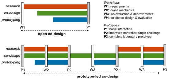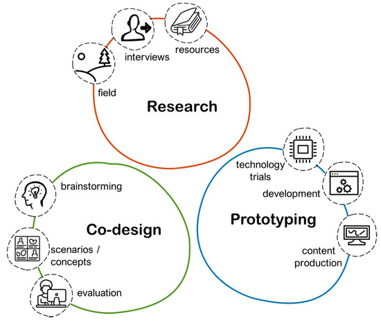 The process consists of three basic activities that are iteratively revisited or sometimes executed in parallel throughout the design and development of the project. These are research, prototyping and co-design (Figure 3).