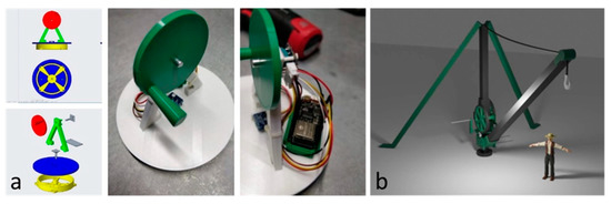 (a) First lo-fi (throwaway) prototype representing the basic functionality parts of the crane. (b) A close-to-final version of the visual design of the virtual crane and characters.