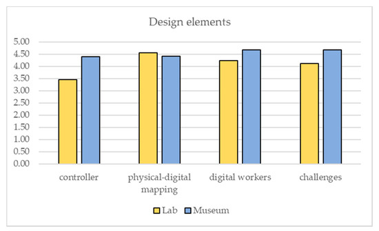 User ratings of the individual design elements of the installation in the laboratory and on-site (museum) evaluation in 5-point Likert scale.