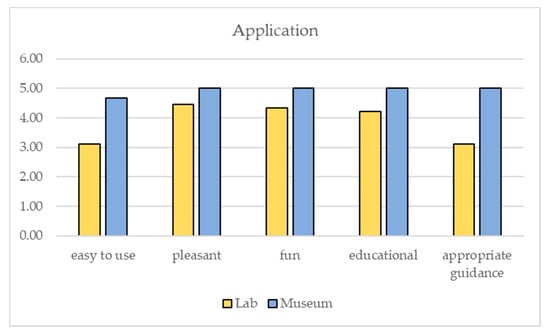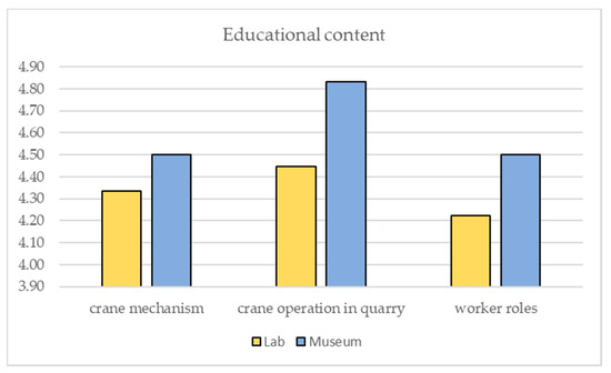 The results of the two user evaluations in the laboratory and museum regarding individual design elements, the application in total and the educational content of the installation are presented in Figure 8, Figure 9 and Figure 10, respectively. It is evident that the rates in the museum evaluation were higher, especially with respect to their ability to understand the educational content. This difference is probably due to the fact that the application has been improved based on some usability issues found in the first evaluation, and also that being already in the museum and having seen the real crane, users were more aware of its role and usage.